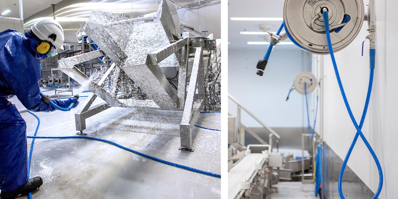 - À primeira vista, essa não é uma solução ideal e higiênica. Ao mover o satélite individual para um andar de máquinas e fornecer ao limpador um controle remoto, agora temos apenas uma tubulação que desce para a planta de produção até os carretéis de mangueiras, explica Peter Jessen.
