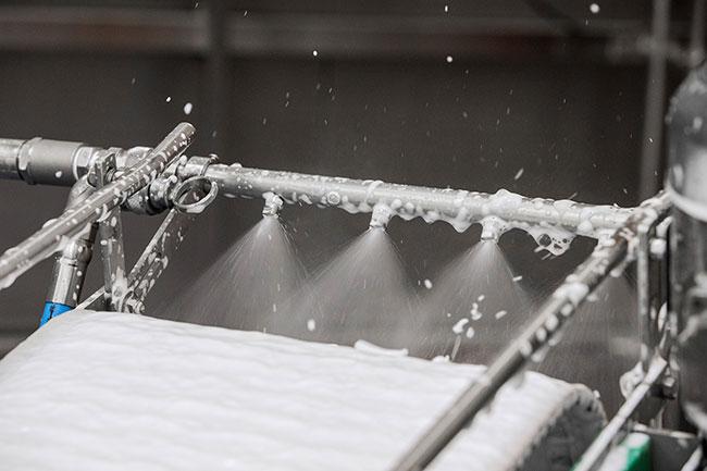 As barras de bocal são colocadas em locais estratégicos interna e externamente no transportador para garantir que cada centímetro da correia seja limpo e sanitizado para evitar o crescimento microbiano. O sistema é modular e pode ser combinado para atender às exigências de todos os transportadores.