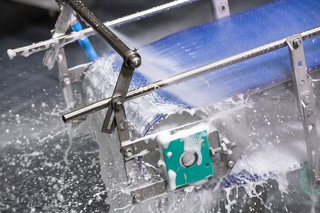 Nossa solução para limpeza e saneamento de esteiras transportadoras pode ser personalizada para combinar com todas as esteiras. Os componentes padrão são combinados em uma solução única para atender às exigências específicas de cada esteira e a solução pode ser aplicada a todos os tipos de esteiras transportadoras.