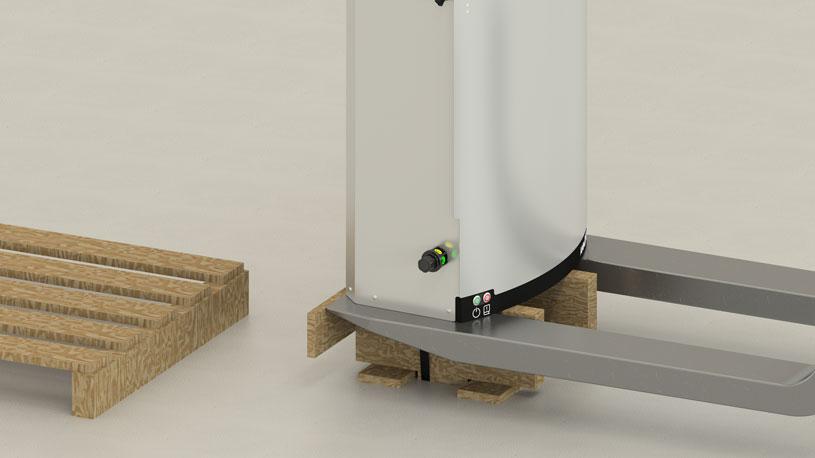 Uma vez na posição vertical, uma empilhadeira pode ser usada para as etapas finais da instalação.