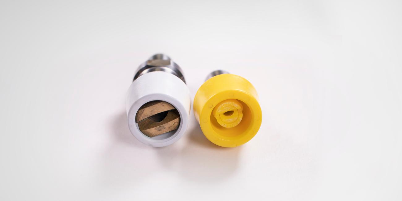O furo no bico espumador (protetor branco) ou bocal de desinfecção (protetor amarelo) está bloqueado por resíduos químicos